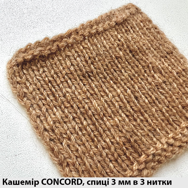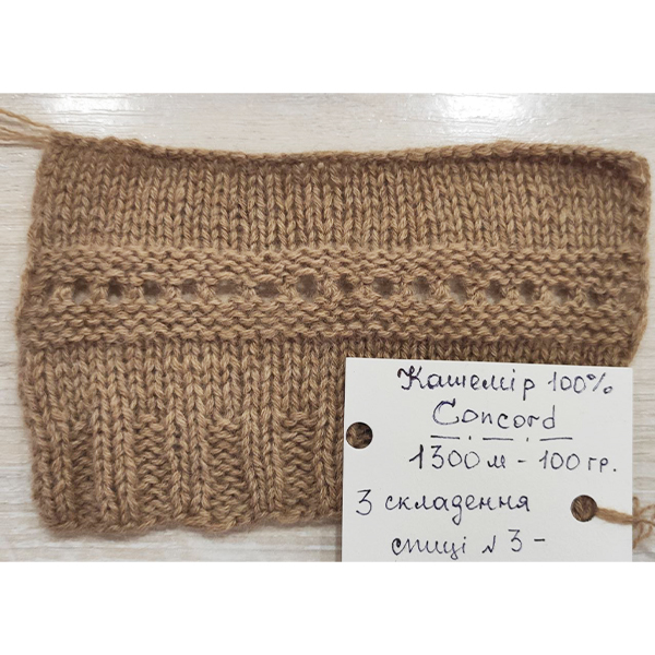 Кашемир 100% Concord 2/26 - тонка ніжна ниточка кашеміру з чудовою круткою, що дозволяє в'язаному полотну бути більш стабільним. Після прання полотно вкривається ніжним кашеміровим пушком. Теплі і м'які речі можна в'язати у 3-4 або більше ниточок. На светер розміру 46-48 знадобиться від 250 г.