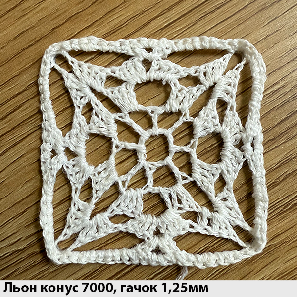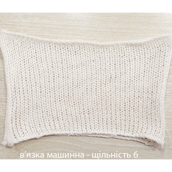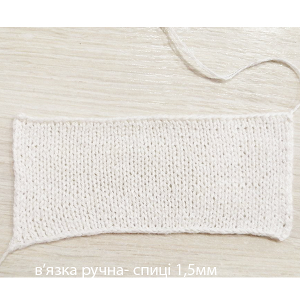 Льняна тонка нитка з маленьким додаванням поліаміда (10%), добре складається. Після ВТО стає м"якішою. Нитка поліаміда додає пружності полотну. Льняна тонка нитка з невеликим додаванням поліаміду (10%), добре складається. Пров'язали руками та машиною зразки, розмістили у прикладі, зразок, який в'язаний машиною зробили з двох деталей та пошили. До прання зразки рівні, після прання косить полотно, але при блокуванні висихає рівно. При повторному намочуванні полотно знову косить, тобто потрібно постійно блокувати виріб після прання.