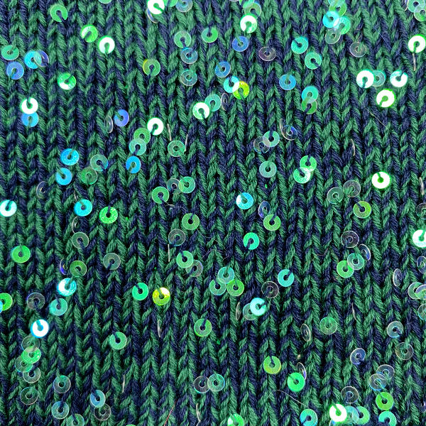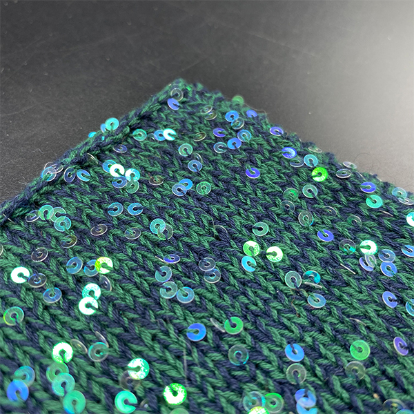 Пряжа представляє собою поєднання трьох бавовняних ниток, до однієї з яких прикріплені прозорі паєтки розміром 3мм на відстані 8-10см. Підходить як додаткова нитка для прикраси будь-якої структури та фактури пряжі, а також може використовуватися як самостійна пряжа. Пряжа унікальна за красою і допоможе оживити як зимове, так і літнє полотно делікатним мерехтінням паєток цього артикулу. Завдяки надзвичайній кольоровій палітрі та насиченим яскравим відтінкам є можливість посилити колір основної пряжі, так, наприклад, у принтових кольорах з мохером ця нитка робить колір ще яскравіше. Наявність цієї нитки відкриває нові можливості для творчого польоту майстринь. Для зразка були використані такі пухнасті нитки як: Мохер на шовку Софт Дрім, Гламур, мохер Супер роял, Арія. Полотно вийшло легке, пластичне, стримано сяюче.