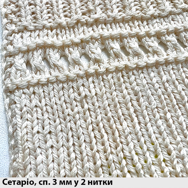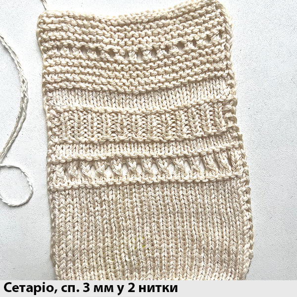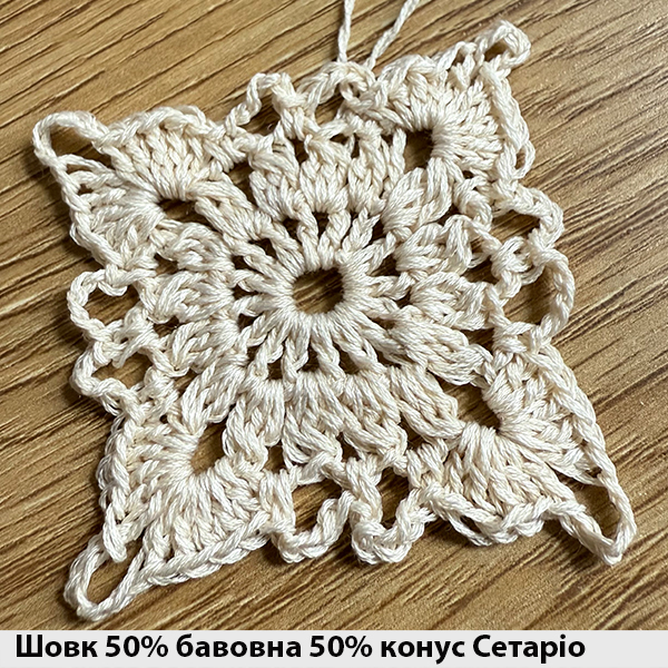 Шовк 50% бавовна 50% конус Сетаріо- нова літня нитка- суміш бавовни і шовка, слабокручене переплетіння 2 ниток шовка і бавовни, нитка матова, полотно добре тримає форму при щільному в'язанні, м'яке завдяки шовку,добре складається.В 1 нитку- спиці 1,5-2 мм, підходить для машинного в'язання.