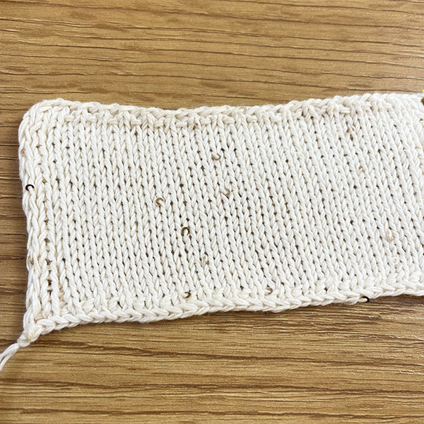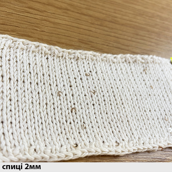 Бавовна/кашемір з паєткою - літньо-демісізонна нитка з золотистими мікро паєтками, які нанизаны на бавовну. Нитка слабо-кручена, м'яка завдяки кашеміру, можна в'язати не дуже щільно, полотно буде тримати форму завдяки складу. Підходить для светрів, футболок, кардиганів зв'язаних спицями та на машинці.