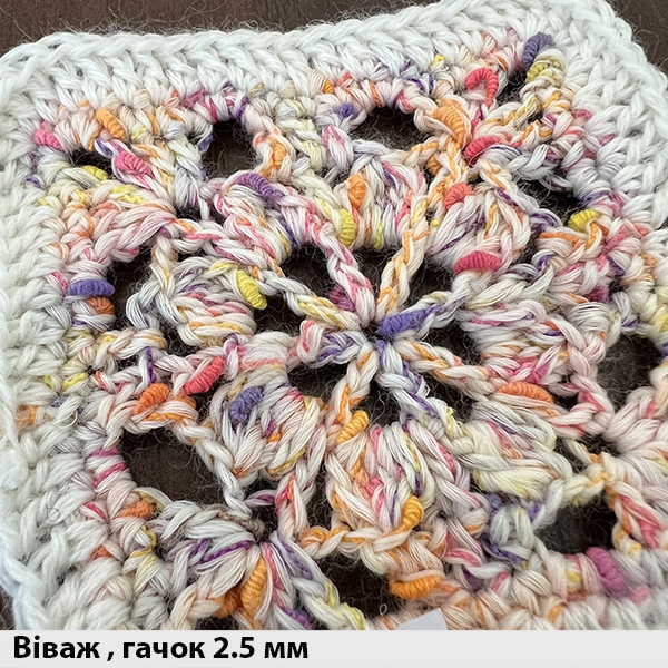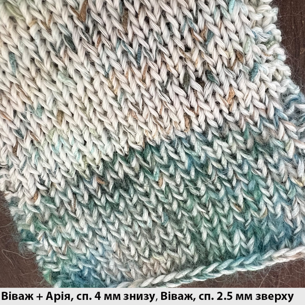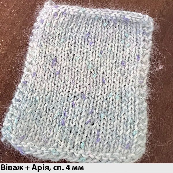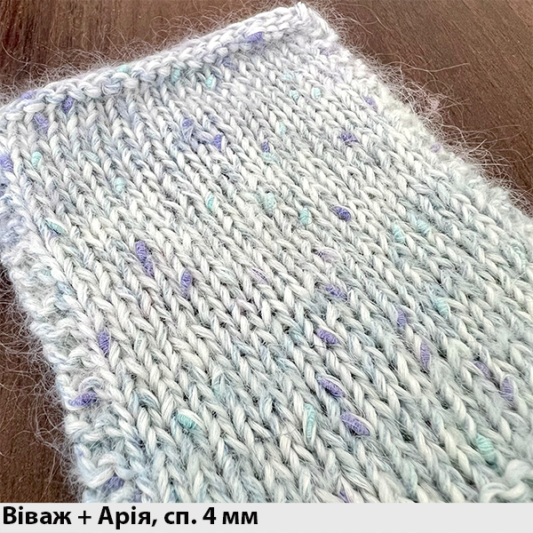Чудова та дуже делікатна новинка на всесезоння, меринос із бавовною Віваж складається із нещільної скрутки дуже тоненьких ниточок мериносу та бавовни, які обвиті однією фантазійною, букльованою, люрексовою різнобарвного кольору ниточкою, що й створює головну прикрасу цієї пряжі. Зразок зв’язаний в 1 нитку спицями 2,5мм. Для стабілізації полотна краще додати тоненьку ниточку мериносу або мохеру (або в тон основної нитки, або в тон букльованої). Також можна в’язати цю пряжу гачком, гарно тримає візерунок. Пряжа підійде для в’язання демісезонних светрів, кардиганів, аксесуарів або дитячих виробів. Пряжа приємна на дотик, не коле