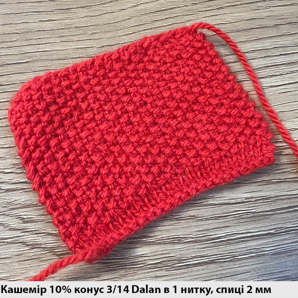 Кашемір 10%  3/14 Dalan -  класичне поєднання кашеміру та мериносової вовни. До прання ниточка досить суха, але після ВТО в'язане полотно стає м'яким, з ніжним кашеміровим пушком, який закриває проміжки між петлями.  Пряжа підходить для створення кардиганів, светрів, шапок. Нитка економна у використанні. Для подвійної шапки потрібно буде 60-80 г, на светр 46-48 розміру - від 200 грамів. Спиці № 3,5.