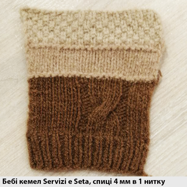 Бебі кемел Servizi e Seta - кардна пряжа, яка містить 98% - вовни верблюда та 2%  пружного поліаміду, завдяки якому полотно, після ВТО, виходить еластичним, дуже гарно тримає форму і не розтягується. Підходить для в'язання шапок, гетрів, шкарпеток, рукавиць та плечових виробів. Можна в'язати, як в одне складення спицями №4-5 мм, так і в декілька складень.