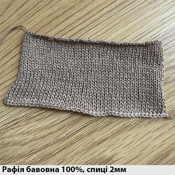 Рафія бавовна це 100% бавовна у вигляді плотно переплетених між собою нитей , її можна в'язати як в одну, так і в декілька ниток. Глянцевий, гарно лягає в полотні, не крутить в виробі, тримає форму. Чудово підходить для машинного та ручного в’язання