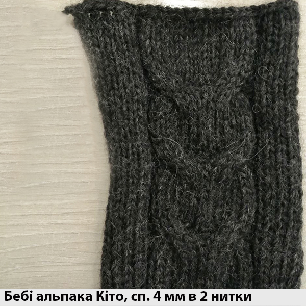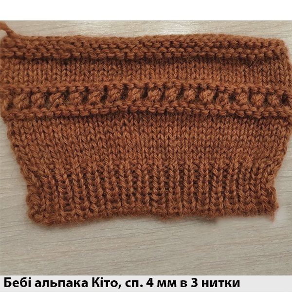 Бебі альпака Кіто - ідеальне поєднання бебі альпаки з мериносовою вовною утворило м'яку і дуже ніжну пряжу для теплих комфортних речей як для дорослих, так і для дітей. Нитка представлена у двох метражах 400 і 600 м на 100 г, що дозволяє в'зати вироби у 2 або 3 складання. В залежності від кількості ниточок в'зати цю пряжу можна на спицях № 3,5-4. На светер середнього розміру знадобиться біля 400 г.