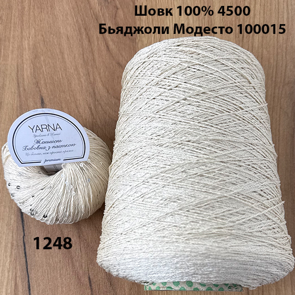 Пряжа представляє собою поєднання трьох бавовняних ниток, до однієї з яких прикріплені кольорові паєтки (в тон пряжі) розміром 3мм на відстані 8-10см. Підходить як додаткова нитка для прикраси будь-якої структури та фактури пряжі, а також може використовуватися як самостійна пряжа. Пряжа унікальна за красою і допоможе оживити як зимове, так і літнє полотно делікатним мерехтінням паєток цього артикулу. Завдяки надзвичайній кольоровій палітрі та насиченим яскравим відтінкам є можливість посилити колір основної пряжі, так, наприклад, у принтових кольорах з мохером ця нитка робить колір ще яскравіше. Наявність цієї нитки відкриває нові можливості для творчого польоту майстринь. Для зразка були використані такі пухнасті нитки як: Мохер на шовку Софт Дрім, Гламур, мохер Супер роял, Арія. Полотно вийшло легке, пластичне, стримано сяюче. Деякі кольори мают прозору паєтку, яка дає додаткову ніжність віддтінку пряжі, деякі кольори з яскравою паєткою, в тон з основою, дає ефект підсилювання яскравості