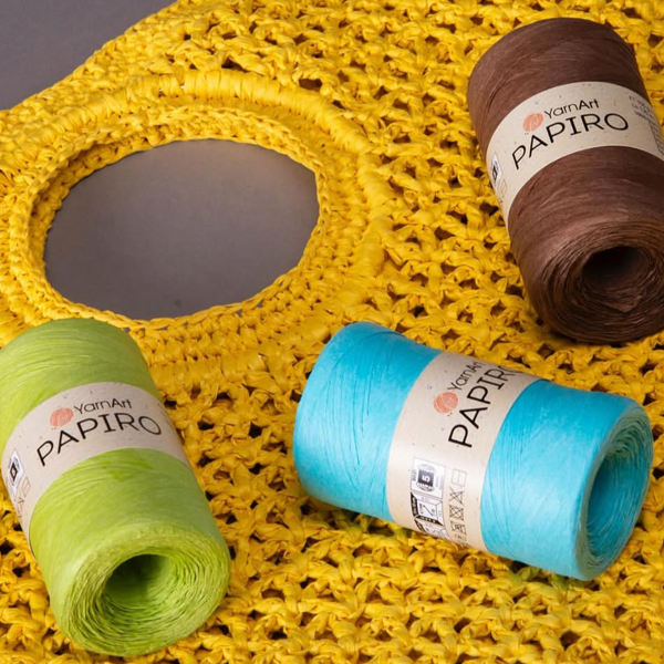 Пряжа Папіро( Раффія) від YarnArt – це популярний артикул рафії серед рукодільниць, що імітує натуральну рафію (волокно з пальмового листя), в складі має 100% целюлозу у вигляді пласкої стрічки шириною 2,5см (в розгорнутому вигляді) з характерним блиском та легкістю у виробі. Ідеально підходить для в’язання літніх аксесуарів гачком. Вона гарно тримає форму - тому чудово підійде для панам, капелюхів, сумок, кошиків. Вироби виходять міцними, легкими та стійкими до сонця, що є важливим фактором для літніх речей. Паперовий ефект дає матову, трохи шурхотливу фактуру, схожу на натуральну рафію. Головними особливостями цієї пряжі є те, що вона не підійде для одягу (колюча та некомфортна для тіла), не любить багаторазового перев’язування, бо може ламатися та втрачати вигляд, а також, важливо пам’ятати, що рафію не можна прати, лише легке вологе очищення або протирання. Пряжа є екологічною, бо має біорозкладну основу.